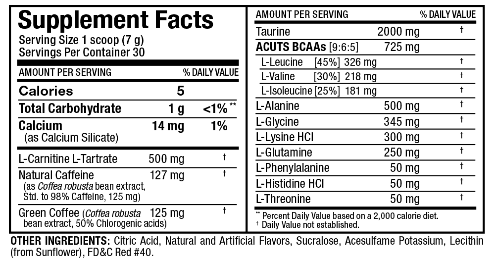 Need an afternoon pick-me-up that won't leave you feeling over-stimulated? Looking for a pre-workout that will provide a clean energy boost while also aiding in fat burning, as well as utilizing fat as energy? A-Cuts is the perfect combination of ingredients that provides a smooth, clean, and sustaining energy boost to power you through your morning or afternoon instead of going for another cup of coffee or an energy drink loaded with sugar. With only 120mg of natural caffeine per serving, A-Cuts is also a great choice as a pre-workout for those of you who don't enjoy high amounts of stimulants, but still need that extra energy and performance boost to help you crush your workout. On top of all this, A-Cuts is also formulated with L-Carnitine L-Tartrate which will help the body utilize fat for energy, help improve blood flow for better oxygen delivery to the muscles, increasing performance, as well as provide a cognitive boost to enhance mental clarity and focus.