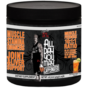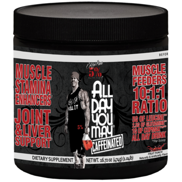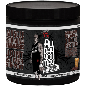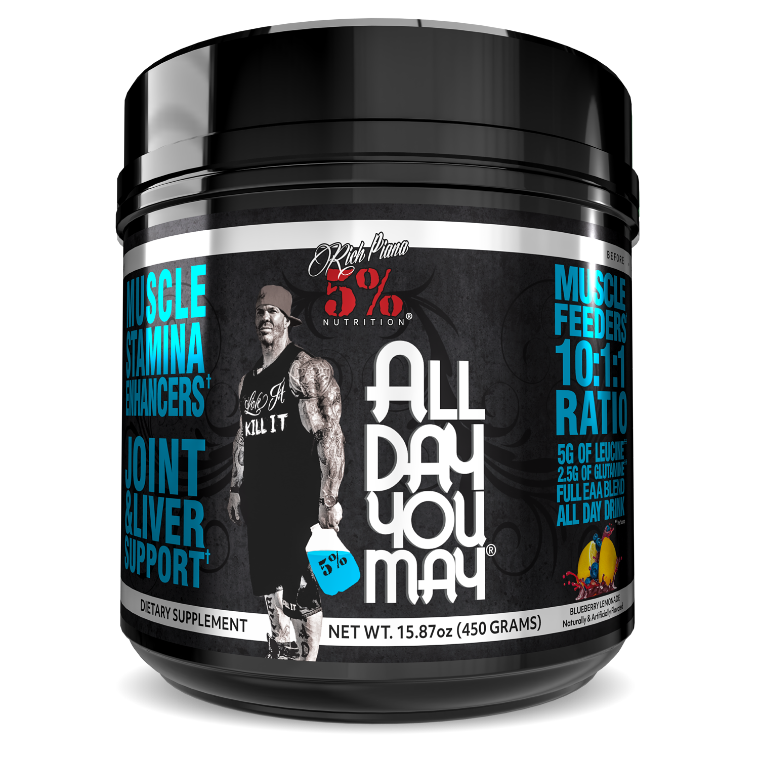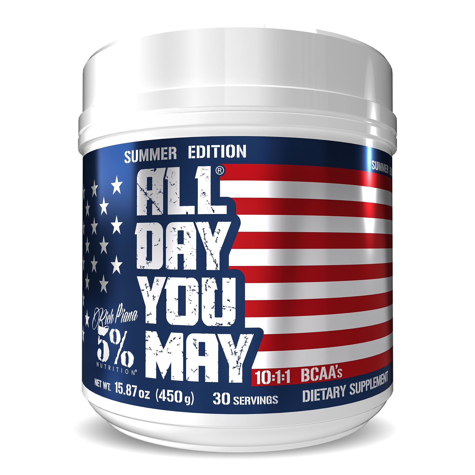 5% Nutrition's All Day You May is a revolutionary BCAA product that is perfect for those looking for maximum recovery and growth. Unlike other BCAA products, All Day You May is an all in one product that provides support not just in the gym, but all day long. All Day You May contains 6g of BCAA's in a L-leucine heavy 10:1:1 ratio, essential and conditionally essential amino acids, and an intra-cellular buffer blend (Creatinol-O-Phosphate, Beta-Alanine) that will keep your body out of a catabolic state which allows for optimal muscle repair, growth, and maintenance.