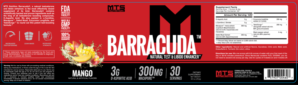 MTS Nutrition Barracuda™ Natural Testosterone and Libido Enhancer is the most effectively dosed Natural Testosterone Booster. Barracuda contains scientifically backed, proven ingredients and features the king of all testosterone boosting compounds, D-Aspartic Acid, alongside L-Carnitine L-Tartrate to boost and free up testosterone, and we didn't stop there! We also included Macapure™, Safed Musli and standardized Eurycoma Longifolia for libido and mental acuity, and TestoSurge™, standardized for a HIGH LEVEL of grecunin to further cement this as the MACHINE APPROVED LEADER IN TESTOSTERONE BOOSTERS!