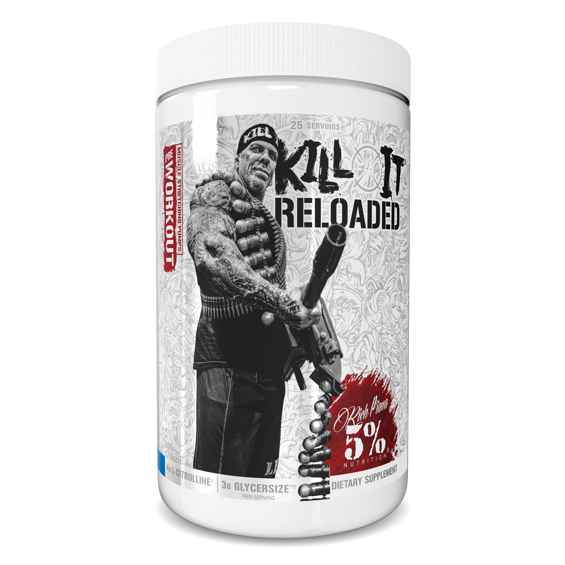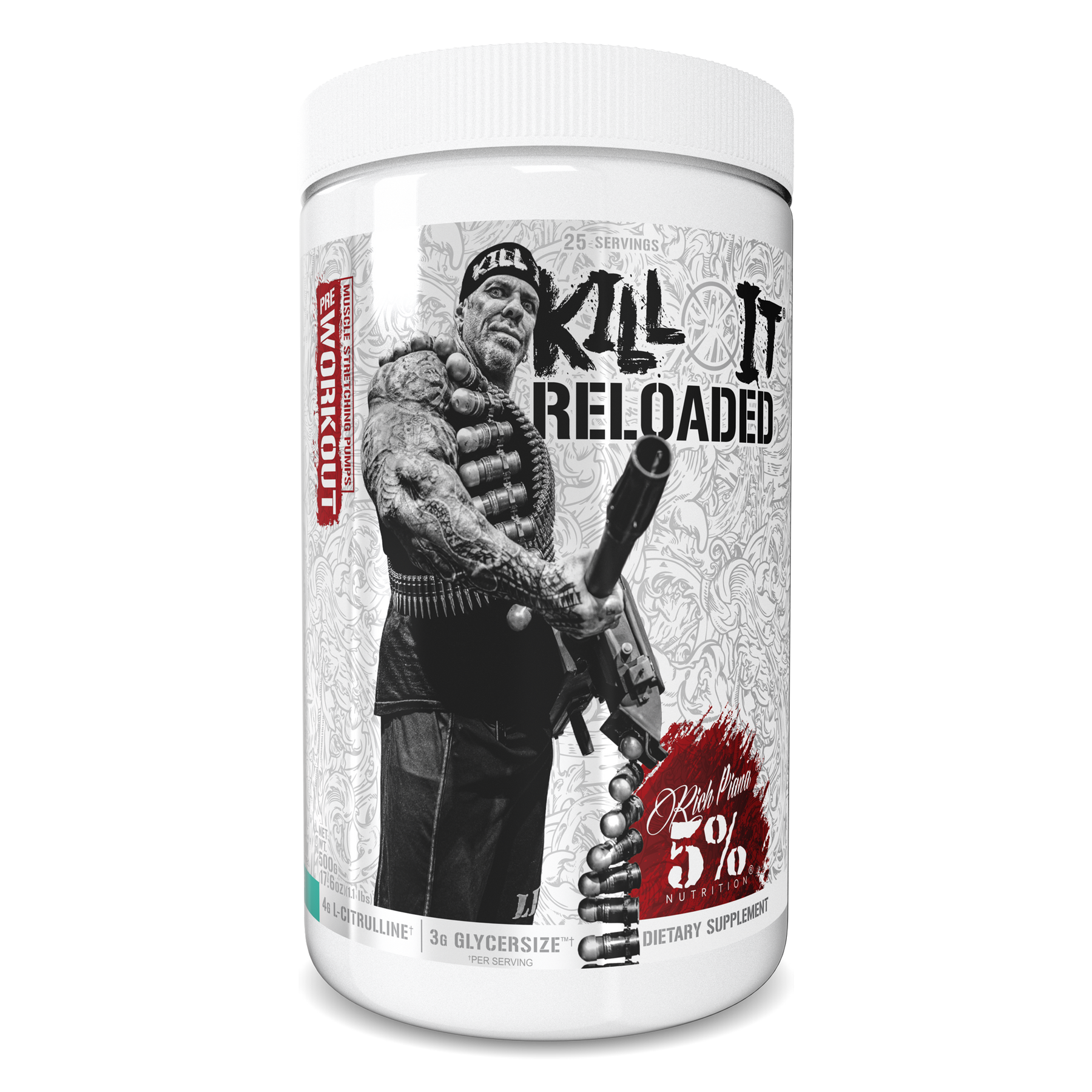 Kill It Reloaded is a very similar, yet more intense version of 5% Nutrition’s other top selling pre-workout, Kill It. Kill It Reloaded contains additional creatine to provide maximum endurance and increased strength, more caffeine at 325mg per serving for an immediate rush of energy with no crash, and a new nootropic blend to ramp up mental alertness and motivation. On top of that, Kill It Reloaded optimizes a high quality nitric oxide blend containing several ingredients such as the patented GlycerPump and L-Citrulline for skin splitting pumps. One scoop of Kill It Reloaded is all you need to take your workouts to new heights!