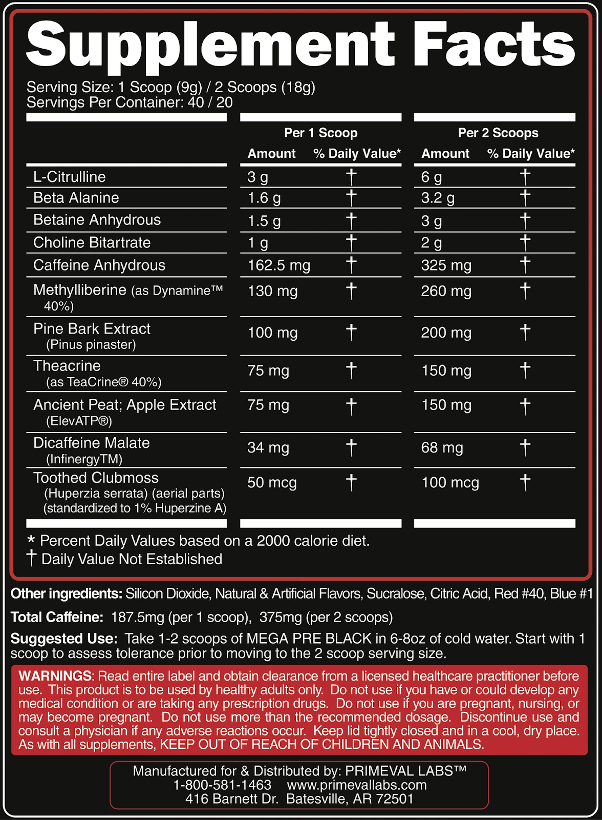 Like hard-hitting, high stimulant pre-workouts? How about a pre-workout for enhanced performance and amazing pumps? Well... how about both? Say no more...Announcing Mega Pre Black from Primeval Labs! Mega Pre Black is a powerhouse pre-workout that contains a powerful combination of stimulants and nootropics alongside potent nitric oxide boosters, creating a truly sensational pre-workout supplement that delivers it all - energy, focus, pump, and performance!
