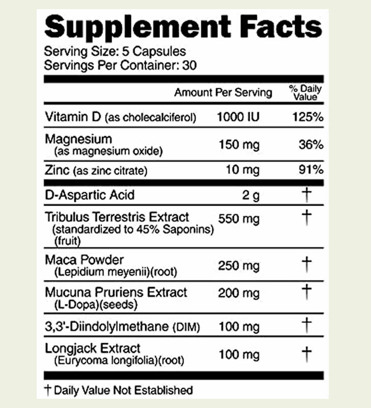 Directions: As a dietary supplement, take 1 serving (5 capsules) once daily. Do not exceed 8 weeks of usage without taking at least 8 weeks off between cycles.