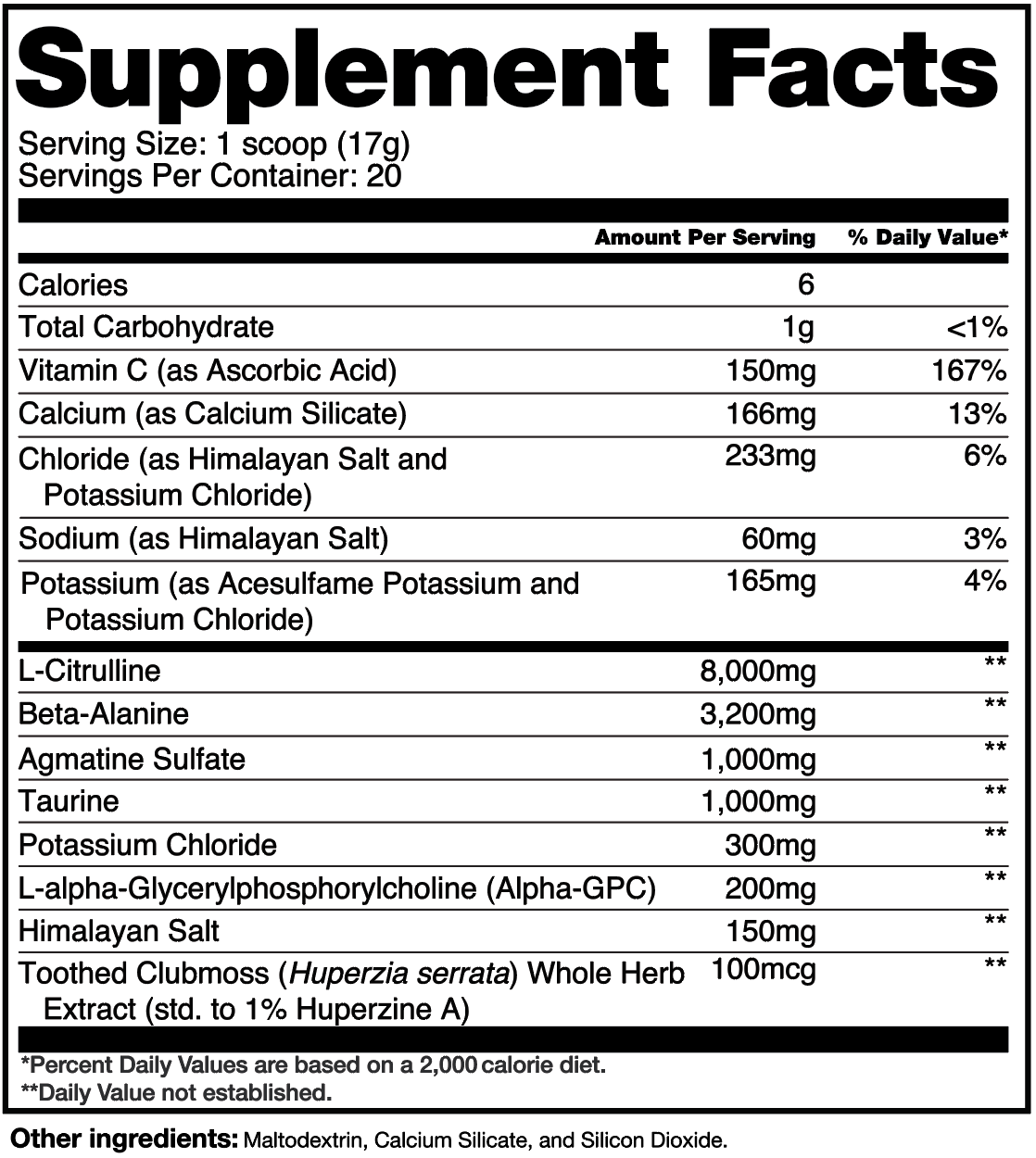 Do you love that feeling your muscles to peak capacity with blood and oxygen? Love chasing "The Pump?" Well this is the product for you! Pump 101 from Alchemy Labs is clinically dosed with 8 grams of L-Citrulline, agmatine sulfate, and Himalayan Salt to deliver mind-blowing, skin-tearing, long lasting pumps. On top of the amazing pumps, Pump 101 is clinically dosed with Beta-Alanine and contains ingredients such Alpha GPC and Huperzine A to Increase endurance, decrease muscular fatigue, enhance mental clarity and focus, and increase athletic performance. Experience the most intense pumps that deliver more blood flow and accelerate results!