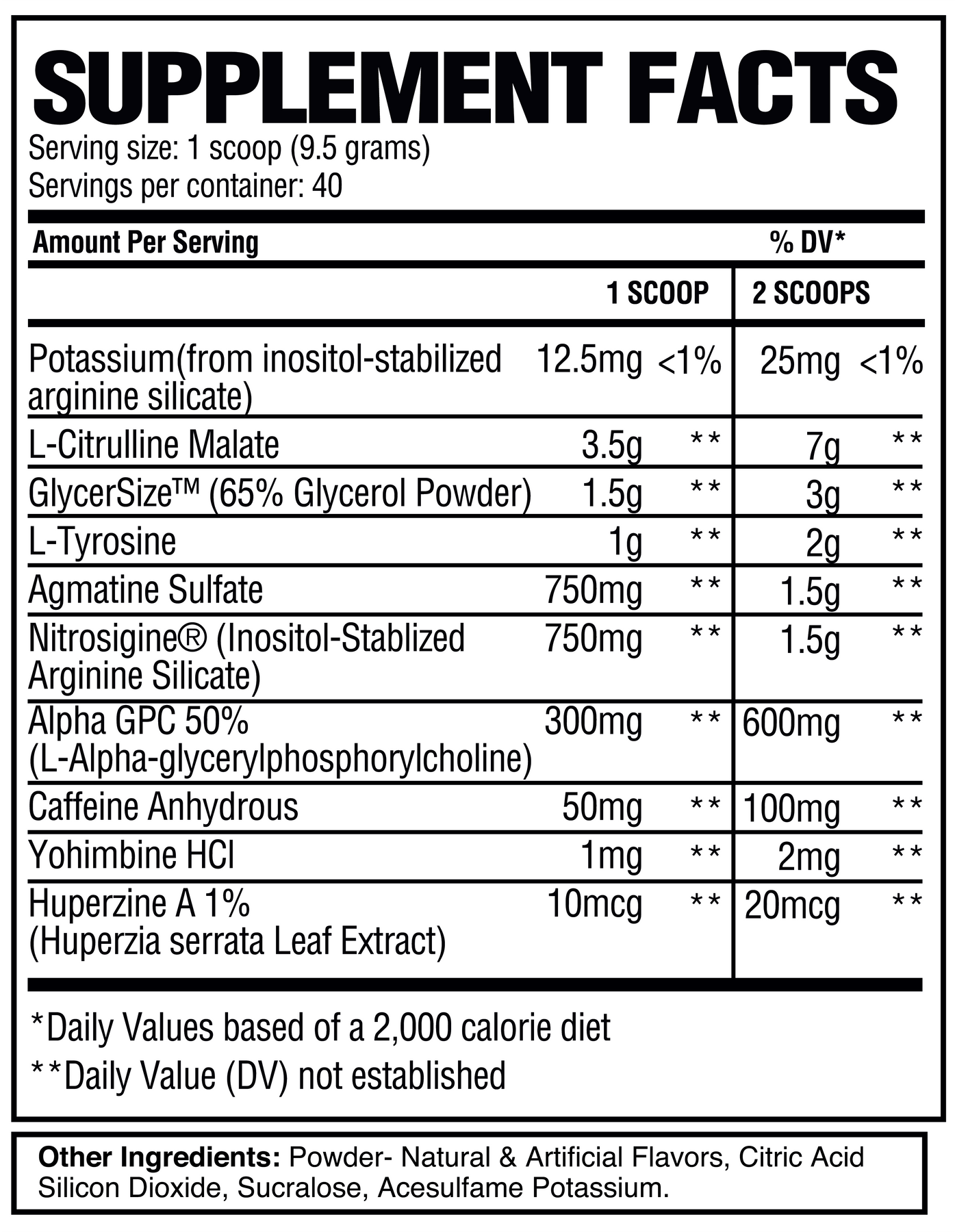 Directions: As a dietary supplement, to assess tolerance we recommend starting off with 1 scoop. Based off gym performance and goals one may wish to use 2 scoops.