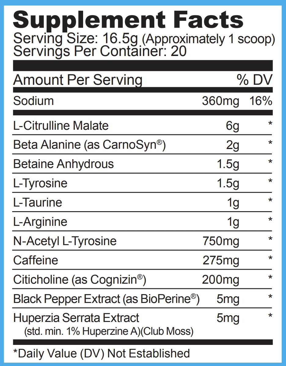 Directions: Use only as directed. Mix one scoop with 10-12 ounces of water and consume 15-20 minutes prior to workout. You may adjust water level to fit taste